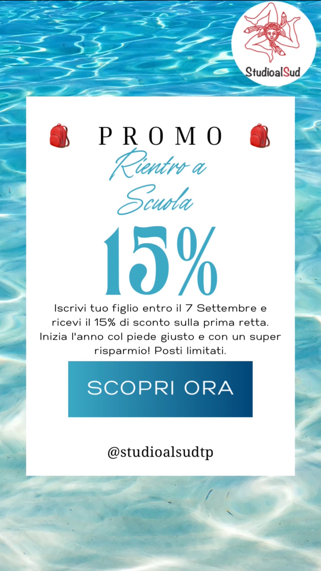 Per tutti i nuovi iscritti al nostro doposcuola entro il 10 SETTEMBRE, c'è uno SCONTO SPECIALE DEL 15% sulla prima retta mensile!